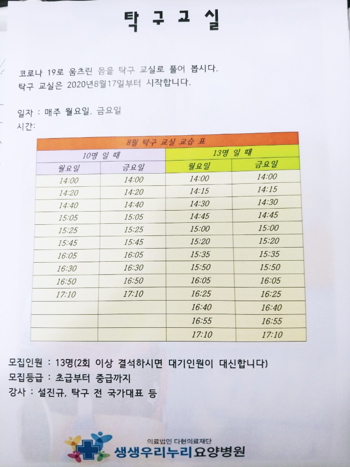 8월 17일부터 병원 내 신설한 탁구장에서